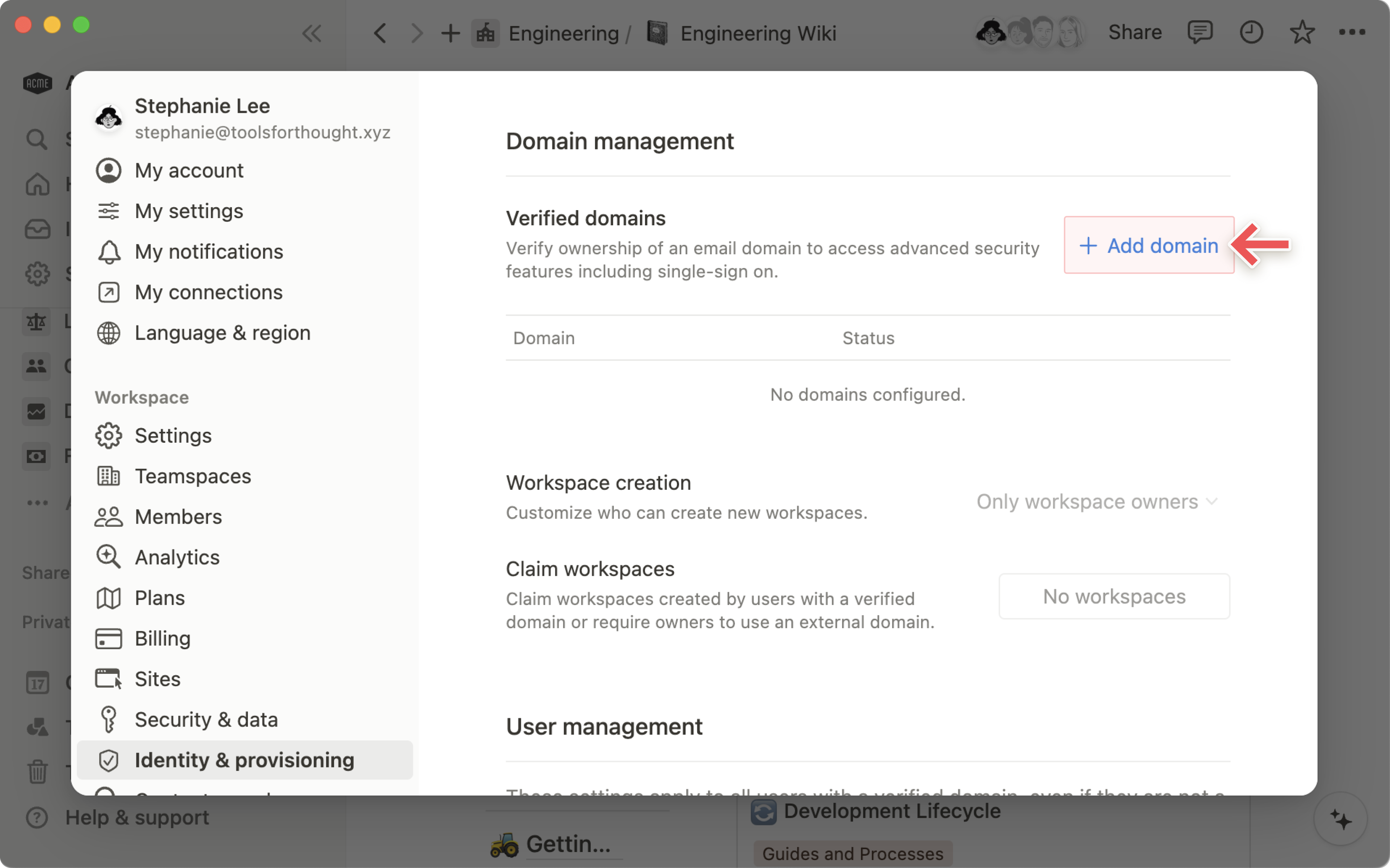 Domain managementThis article will cover how to verify ownership of a domain and which advanced workspace security settings it will unlock for Enterprise customers 🧷