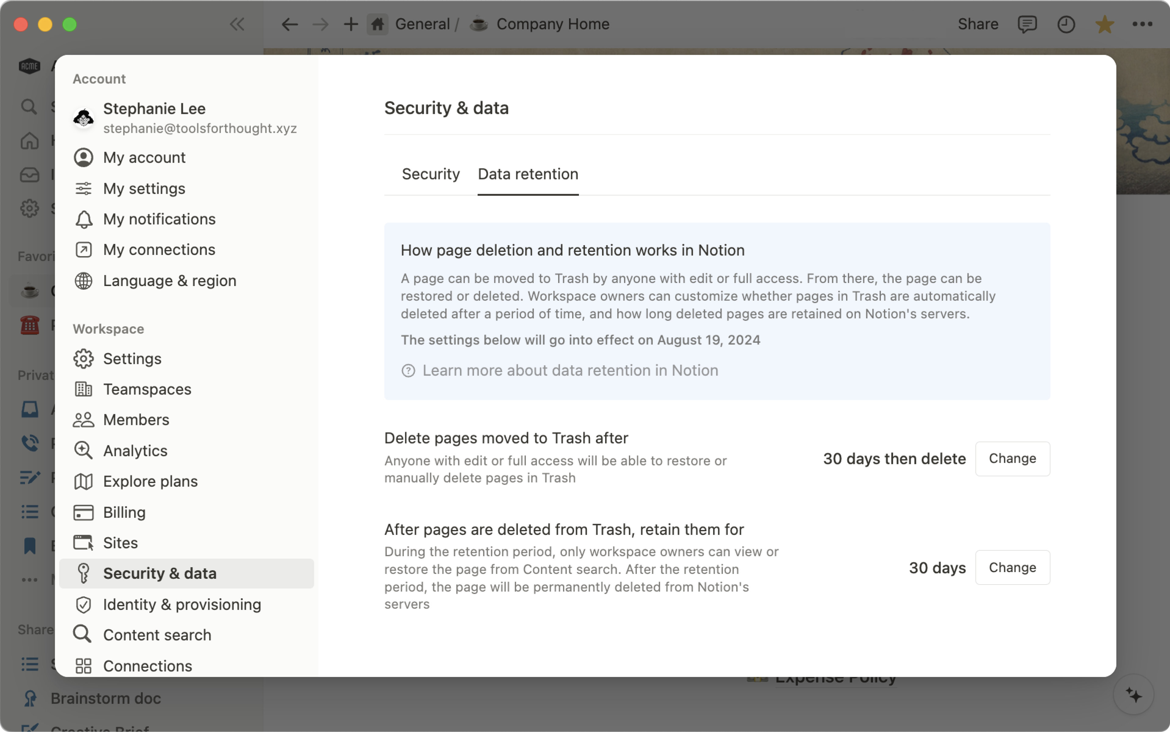 Custom data retention settingsEnterprise workspace owners have control over when users’ pages are deleted from Trash, and how long they can be retained for afterwards 🗑️
