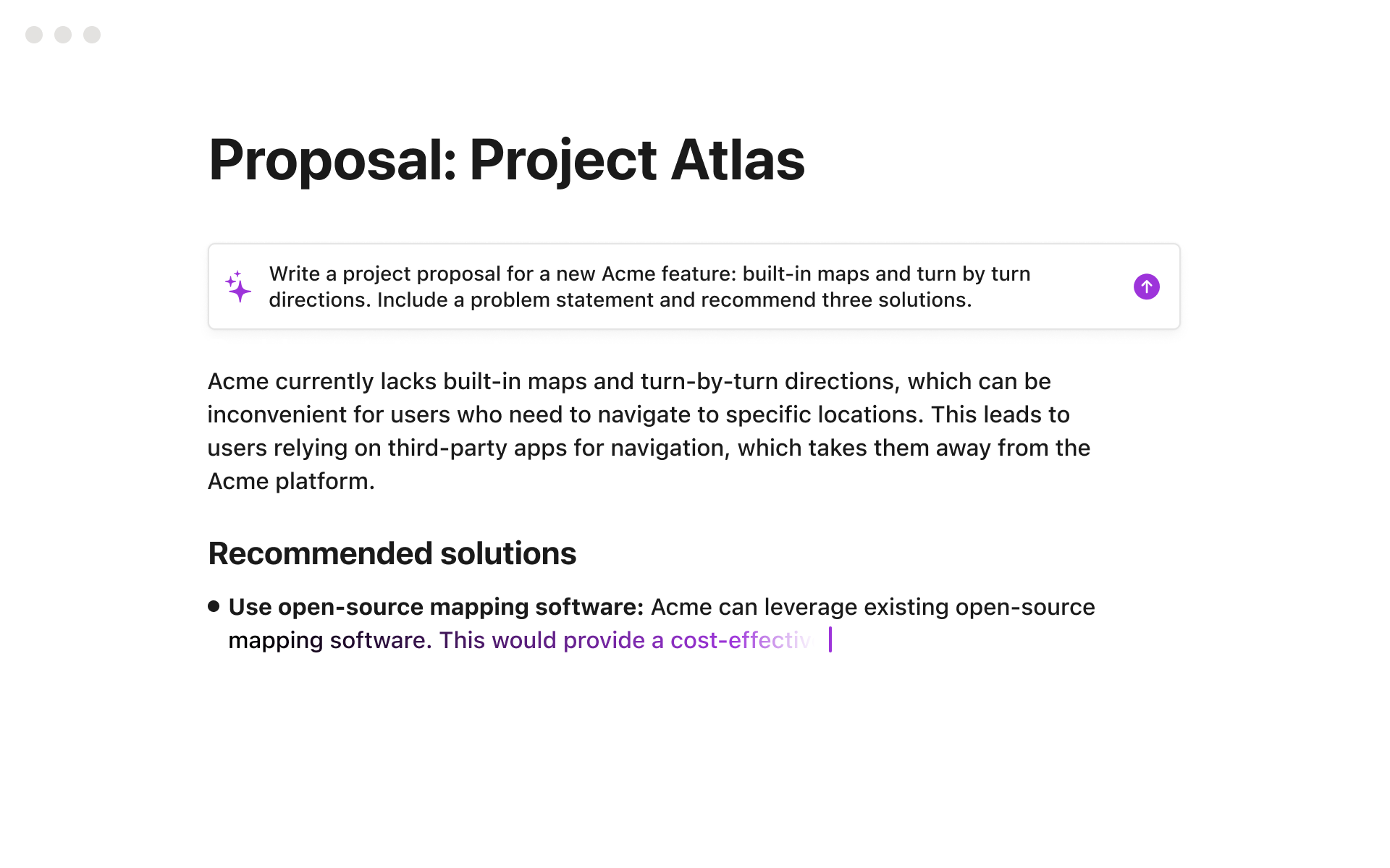 Generate a first draft for your project plans in seconds. Or write it yourself, and ask AI to make it more effective.