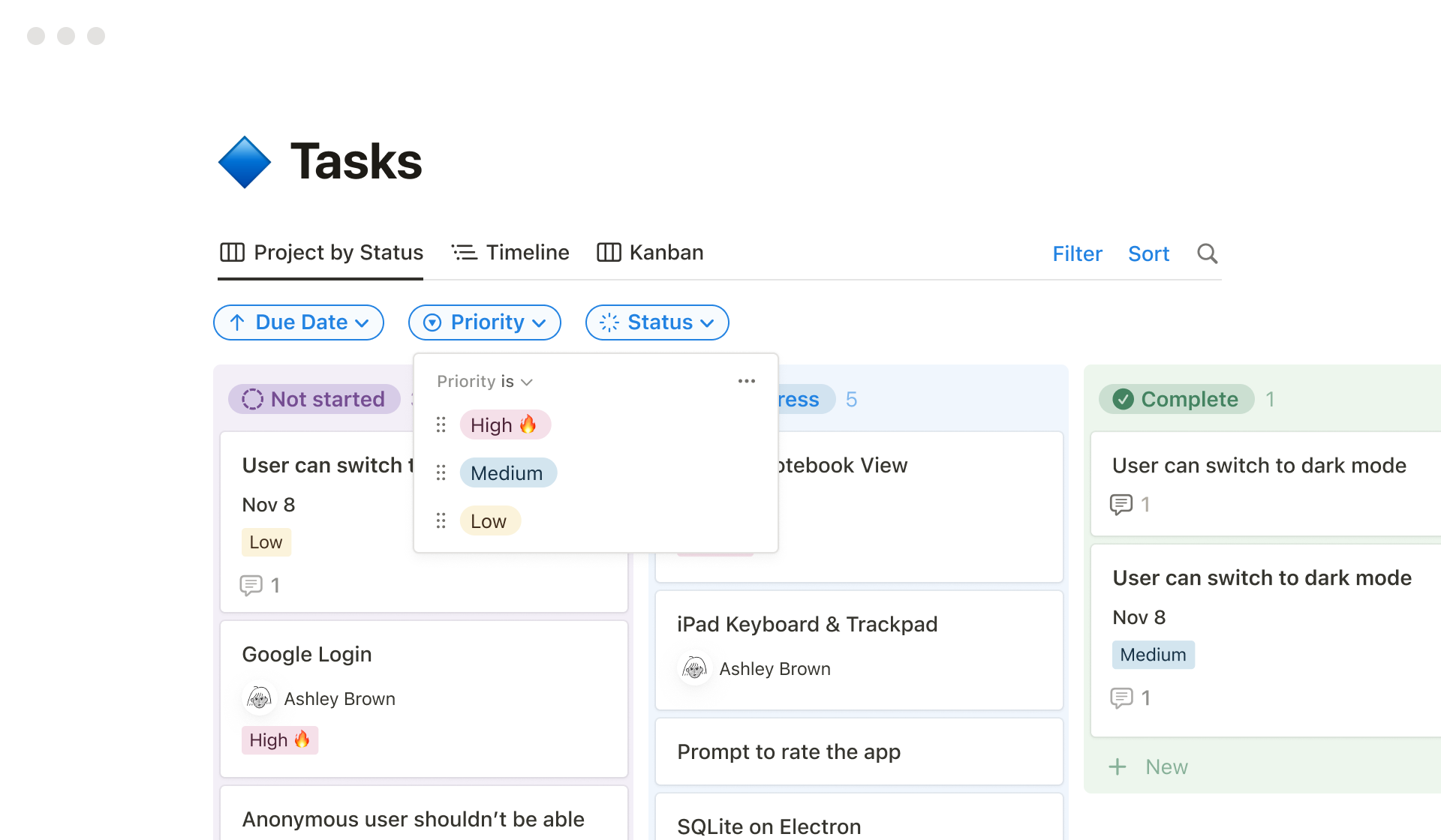 Show only tasks assigned to you, or items marked as urgent. Break down any complex project in the way that’s most helpful to you.
